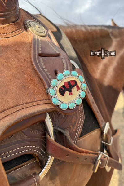 Blaze some trails with the Trail Blazer Pendant! A bold buffalo centerpiece framed by turquoise stones and western flair. Perfect on a jacket, hat, or wild rag, this piece adds a punch of rowdy charm anywhere you pin it.