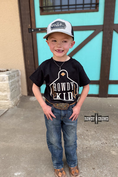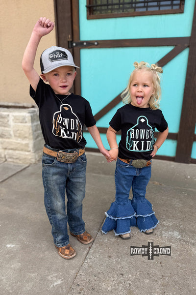 Our newest addition to the Rowdy Kid collection, the Rowdy Kid tee! Unleash your kiddo's rowdy side with this black, lightweight, soft tee. Featuring an adorable, brown ear tag, this tee is perfect for every adventure your little cowgirl or cowboys take!