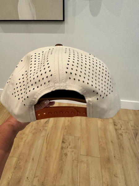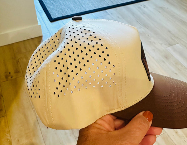 Support Your Local Bearded Dads Leather Patch on a Tan hat with brown bill Lonestar Hat. These are comparable to the Richardson 355 Performance Hat just not as expensive.